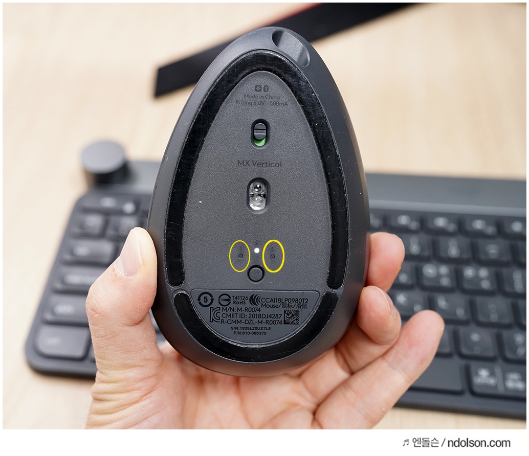 로지텍 MX vertical의 후면에 보면, 수신기를 총 3개를 연결할 수 있게 되어 있습니다. 로지텍 크래프트 키보드와 같이 연결하니 USB 수신기는 1개만 사용하고도 마우스까지 연결할 수 있게 설정되어 배터리 감소 효과를 좋게 해 주었습니다.