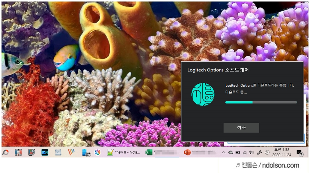 로지텍 MX vertical을 연결하는 방식은 3가지로 USB 유선 연결, 블루투스 페어링, 로지텍 유니파잉 수신기 방식이 있습니다. USB 수신기를 연결하자마자 로지텍 SW가 설치되었습니다.
