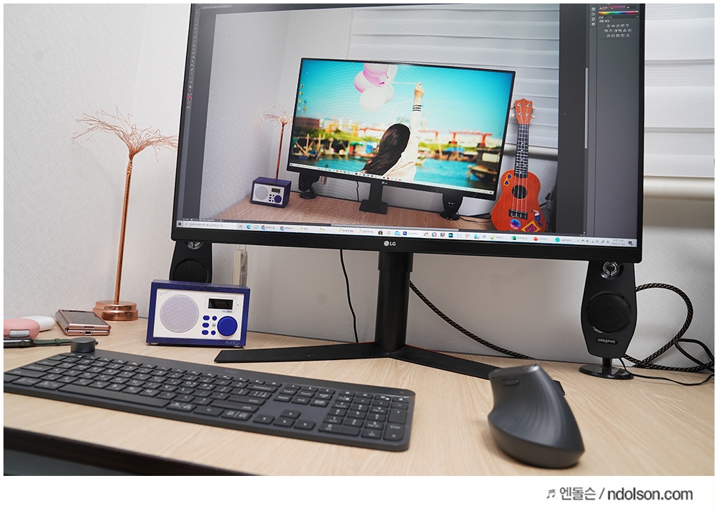 또 무선 마우스, 무선 키보드 조합으로 선이 책상을 많이 차지하던 모습과 달리 깔끔하게 정리할 수 있어 좋습니다. 유선/무선 모두 지원하는 무유선 마우스/키보드로 깔끔하게 쓸 수 있습니다.