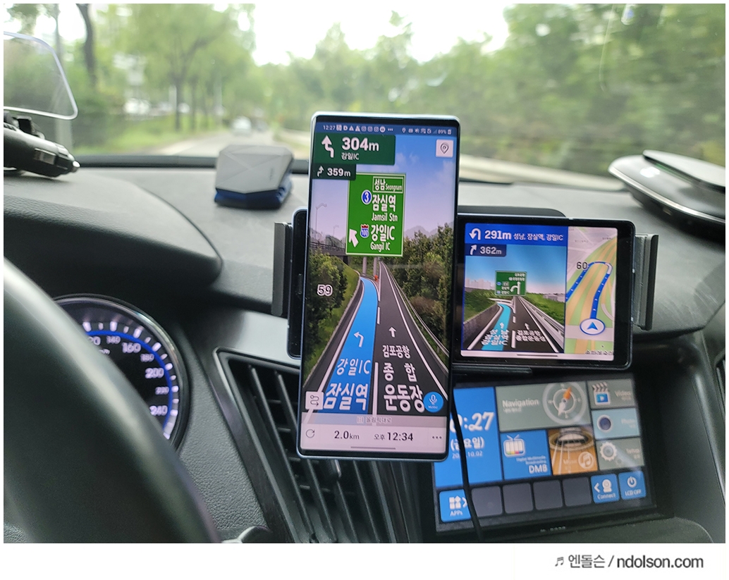 또 자동차 내비게이션을 사용할 때, 다른 작업도 가능한 세컨드 스크린의 활용이 돋보이는데요. 필자는 이런 것도 가능할까 하는 생각에 2개의 화면에 내비게이션을 띄워 보았습니다.
