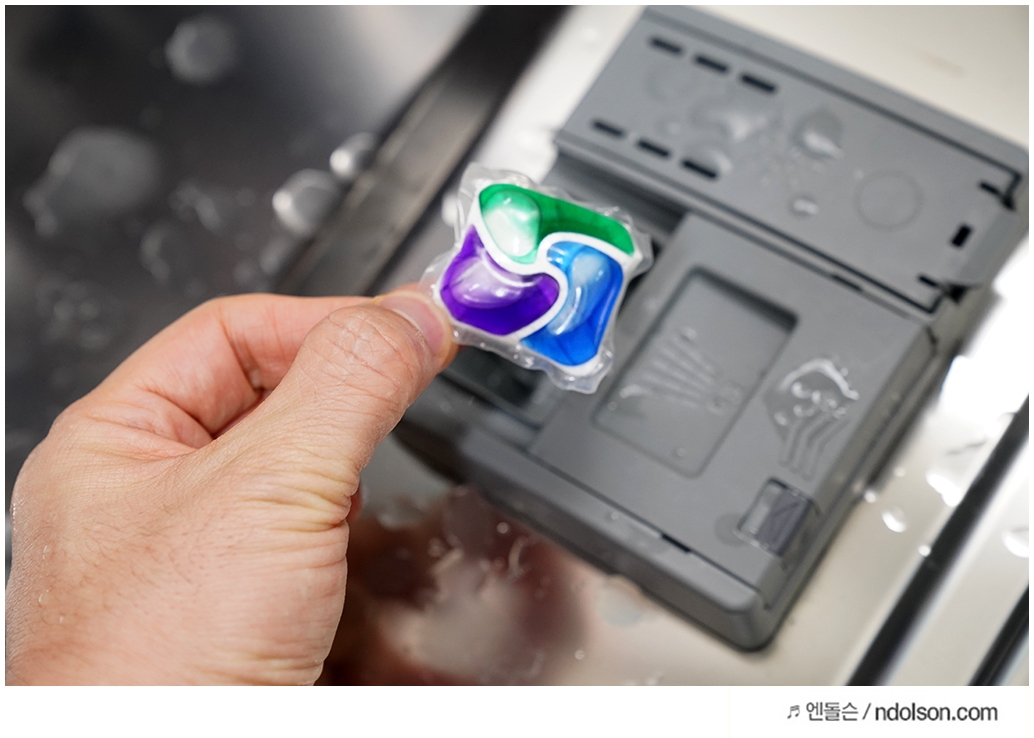세제와 린스를 따로 투입할 필요 없이 한번에 되어 있는 게 가장 큰 장점이고 특징입니다. 그냥 그대로 넣어두면 비닐체 녹아서 됩니다. 만약 투입구에 넣어둔게 달라 붙는다면 통째로 그릇 위에 올려 두어도 좋습니다. (가끔 투입구에 눌러 붙을 수 있음)