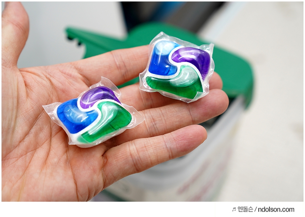 세제와 린스를 따로 투입할 필요 없이 한번에 되어 있는 게 가장 큰 장점이고 특징입니다. 그냥 그대로 넣어두면 비닐체 녹아서 됩니다. 만약 투입구에 넣어둔게 달라 붙는다면 통째로 그릇 위에 올려 두어도 좋습니다. (가끔 투입구에 눌러 붙을 수 있음)