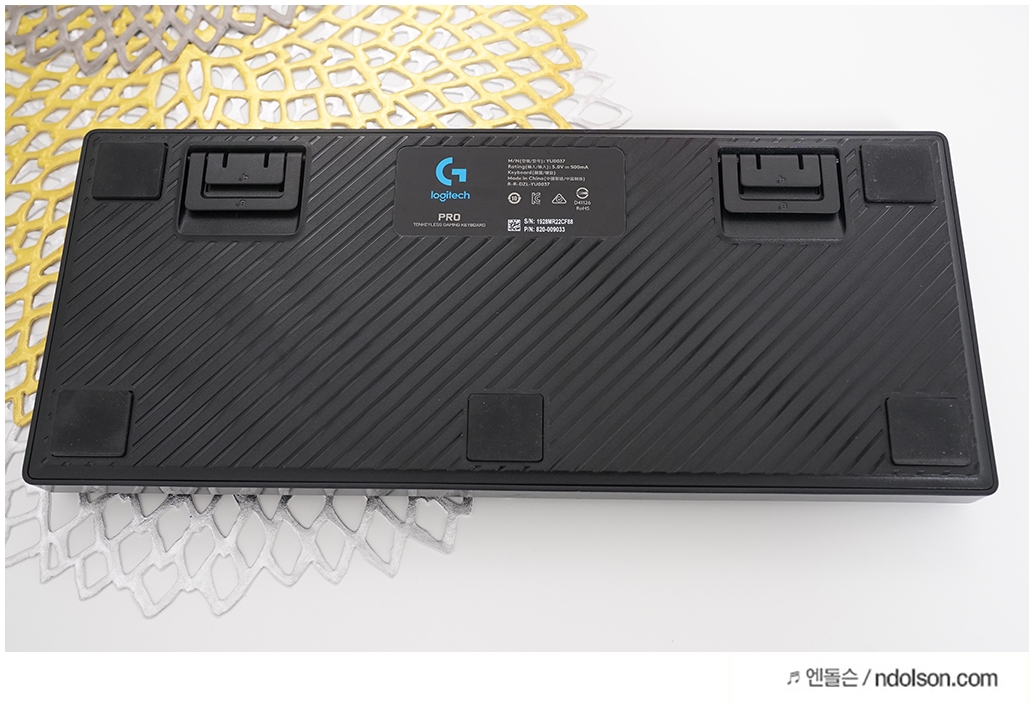 하단에는 강력한 미끌림 방지 고무 피트가 각각 위치하고 있어서 미끌림 방지를 해줍니다. 게임 도중 실수로 키보드를 밀더라도 절대 밀리지 않더군요. 또 2단의 높이 조절이 있어 개인의 신체에 맞는 폰이 조절이 가능합니다.
