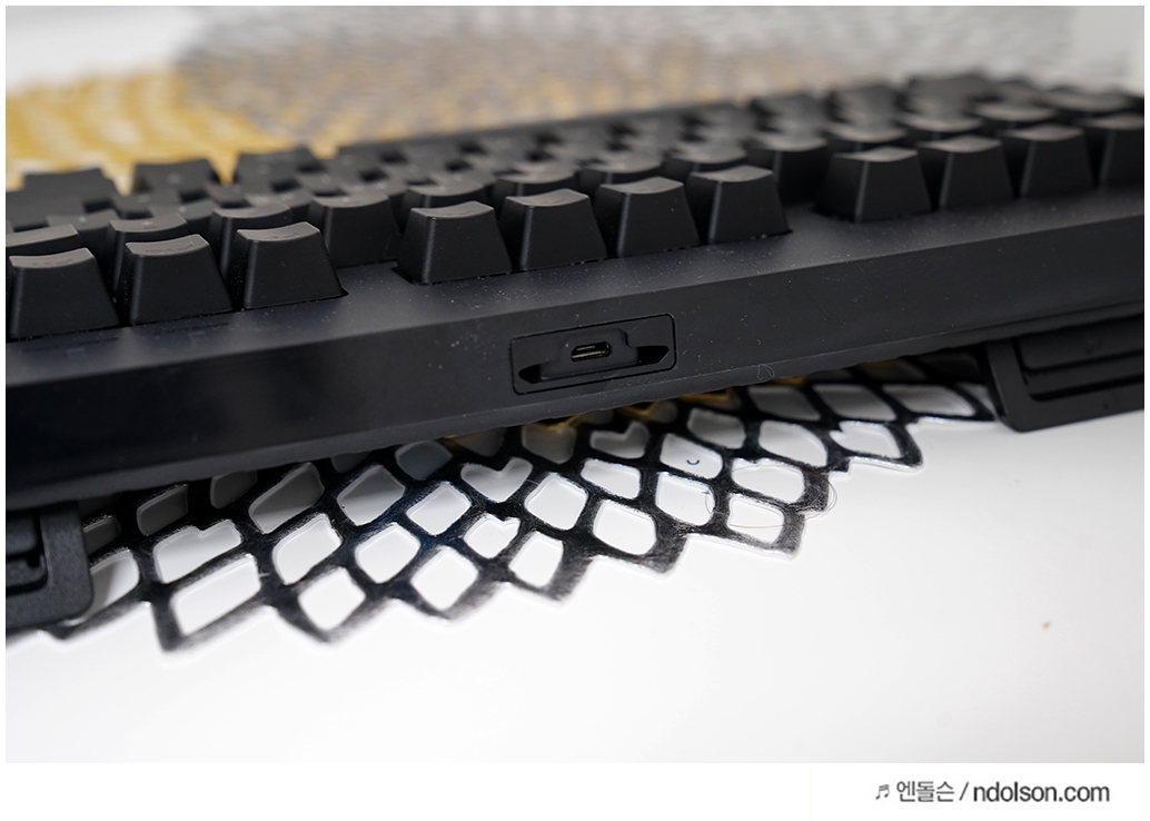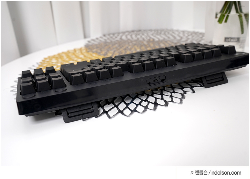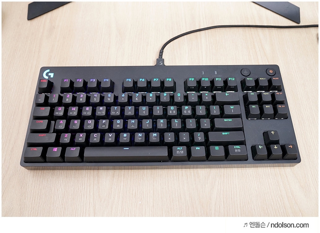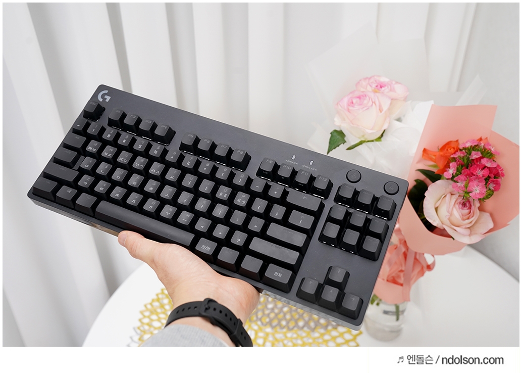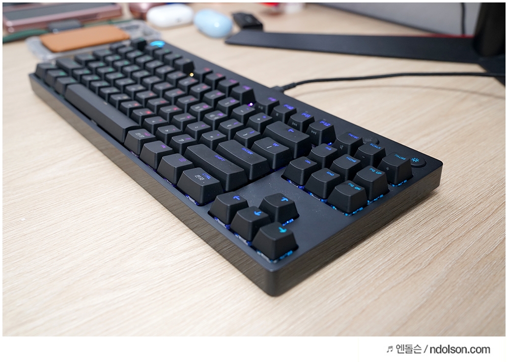 디자인은 텐키리스 형태로 우측의 숫자패드가 없어 공간 활용에 이점이 있습니다. 책상을 보다 넓게 쓰고 싶은 분이라면 좋습니다. 숫자 입력을 많이 하시는 분이라면 불편할 수도 있지만, 풀사이즈의 키보드보다 공간 활용에 중점을 두시는 분이라면 텐키리스 형태의 키보드가 활용성이 좋을 수 있습니다.