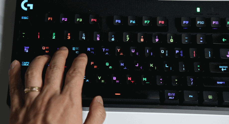 PC에 연결하면 보이는 화려한 LIGHTSYNC RGB 조명은 정말 이쁩니다. 약 1,680만 가지 색상값을 표현하고 온보드 메모리에 저장할 수 있습니다. 또 로지텍 G HUB 소프트웨어를 사용해 조명을 커스터마이징하고 애니메이션 효과를 줄 수 있습니다. 게임을 즐기거나 자신이 선호하는 색상의 키보드를 만들어 볼 수 있다는 장점이 있습니다.