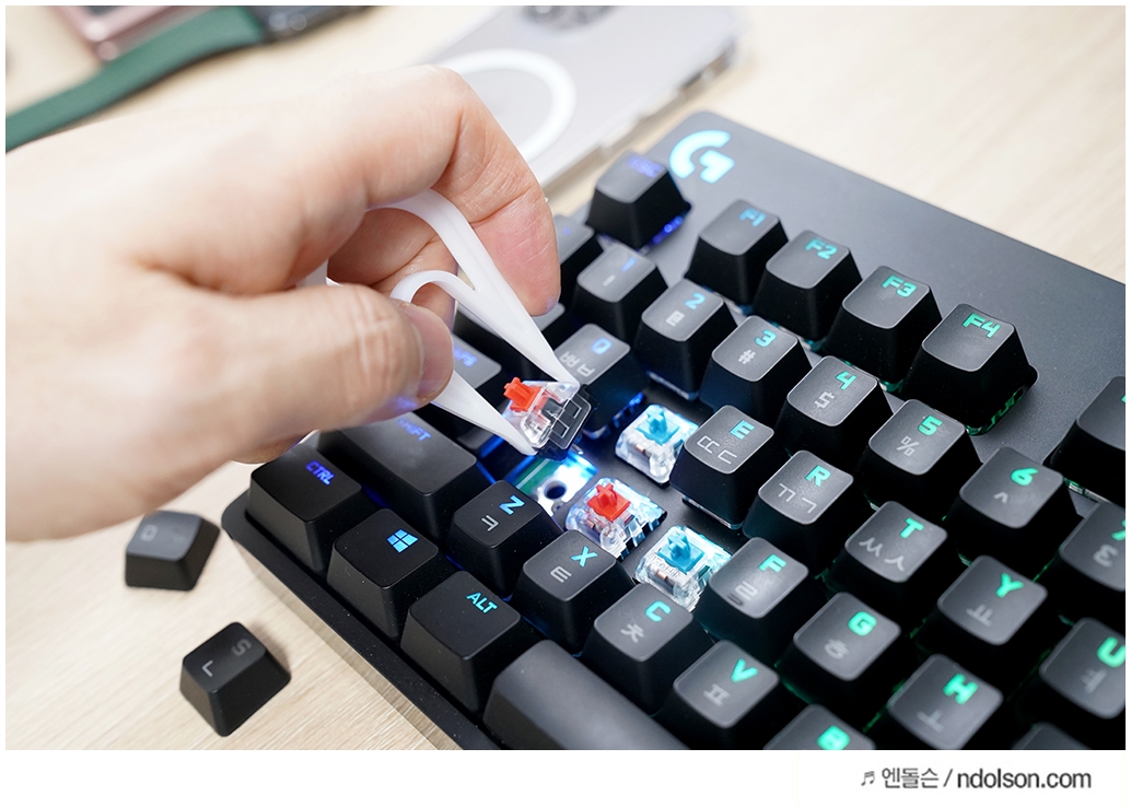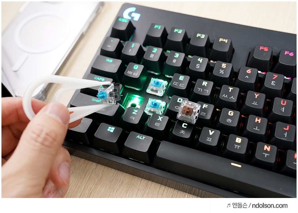 키 교체를 할 수 있는 도구인 리무버를 이용하여 키보드 키캡을 빼고 스위치를 교체하였습니다. 로지텍 키보드는 스위치 교체가 편리하게 설계되어 있어 교체가 쉽습니다.