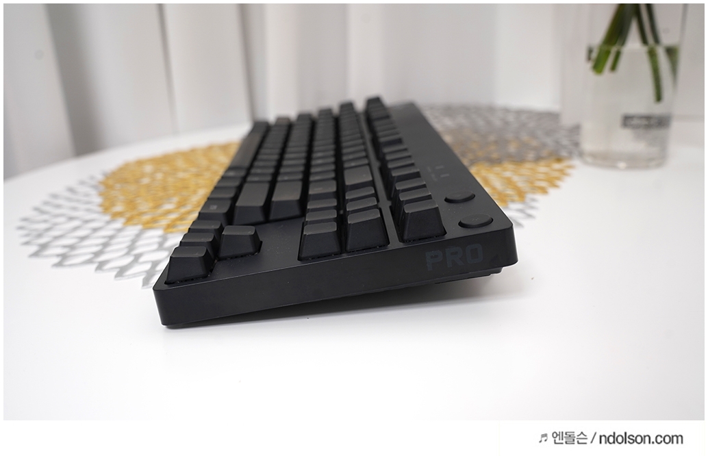 측면도 이쁜데 PRO 문구가 보일 듯 말 듯 프린팅 되어 있습니다. 전체적으로 블랙 키보드가 너무 이쁘다고 생각됩니다.