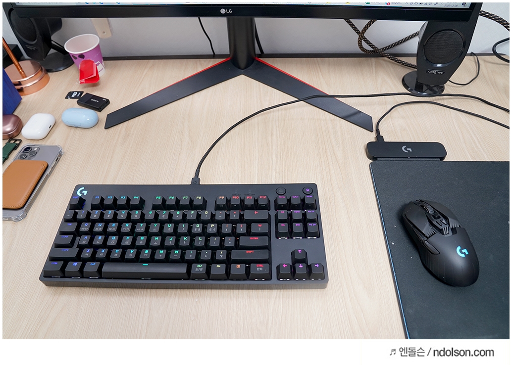로지텍 G903 무선 마우스와 무선 충전패드 옆에 자리한 로지텍 G PRO X 기계식 키보드입니다. 숫자패드가 빠져 공간 차지도 적으면서도 타건감이 너무 좋아 선호하는 기계식 키보드입니다.