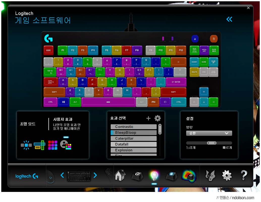 키보드 효과는 로지텍 게임 소프트웨어를 통해 다양한 설정이 가능합니다. 각 키마다 원하는 개별 커스터마이징이 가능하니 취향 반영을 확실히 할 수 있습니다. 또 LIGHTSYNC를 지원하는 마우스나 다른 로지텍 방비가 있다면 조명 동기화로도 즐겨 볼 수 있습니다.