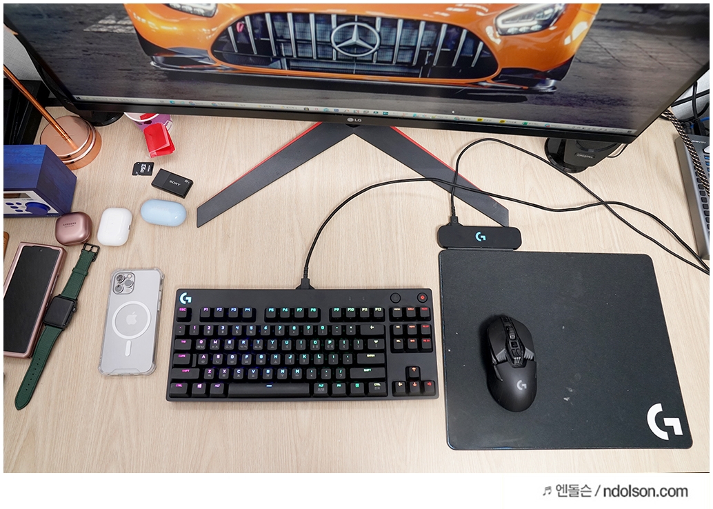 로지텍 G903 무선 마우스와 무선 충전패드 옆에 자리한 로지텍 G PRO X 기계식 키보드입니다. 숫자패드가 빠져 공간 차지도 적으면서도 타건감이 너무 좋아 선호하는 기계식 키보드입니다.
