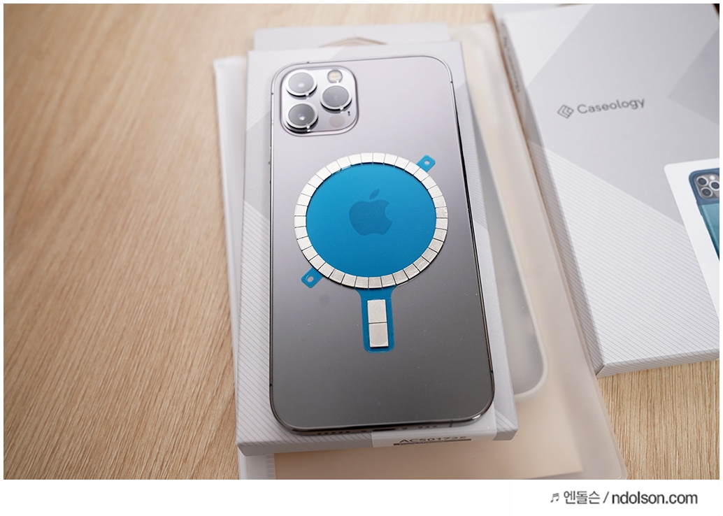 이렇게 아이폰12 프로 후면의 자석에 마그네틱 자석을 먼저 붙이고 케이스와 장착을 해야 정확한 위치를 찾을 수 있습니다.