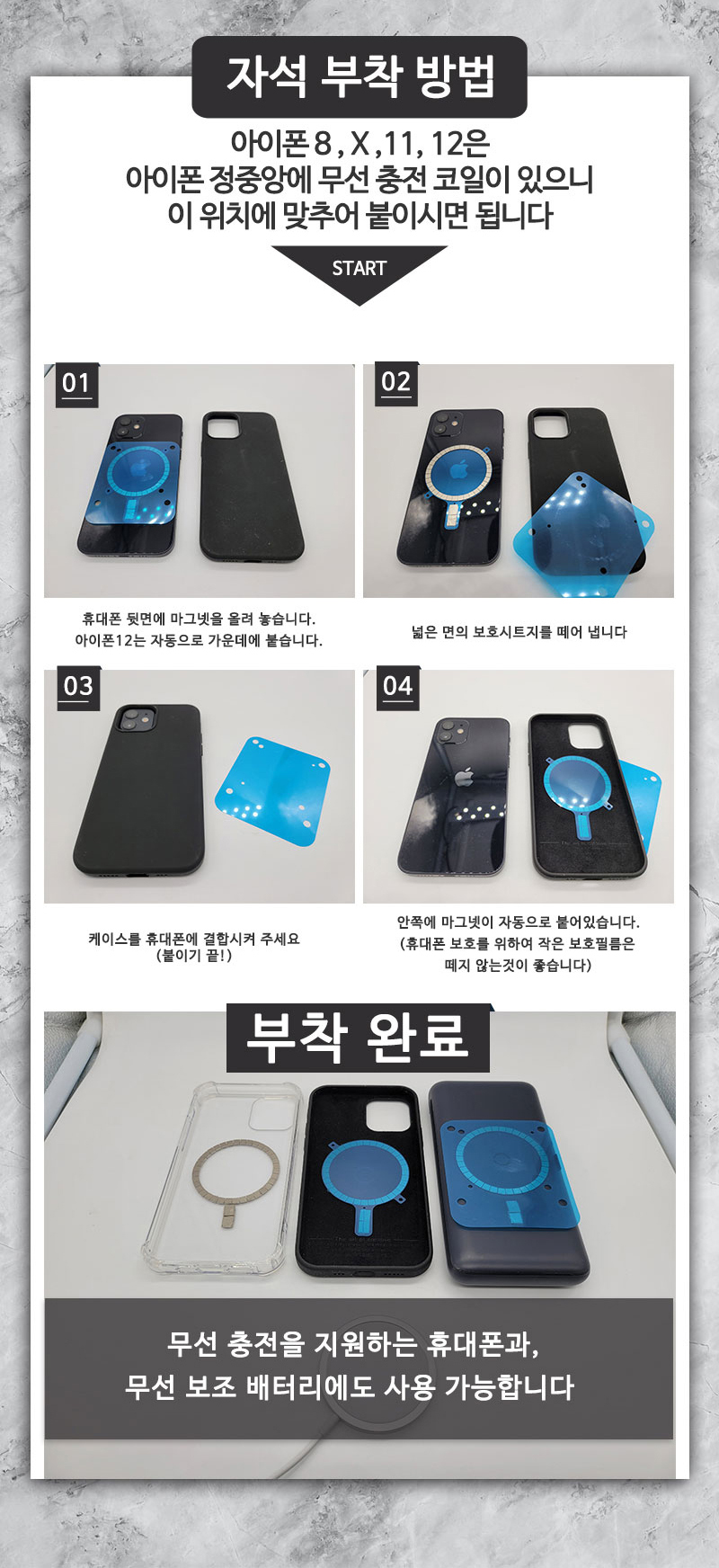 아이폰11 등 애플 아이폰에 사용할 수 있습니다. 붙일 때 주의할 것은 아이폰12의 경우, 후면 자석에 가져다 대어 잘 붙여 두고 케이스에 붙여야 합니다. 않그러면 자력이 약해 집니다.
