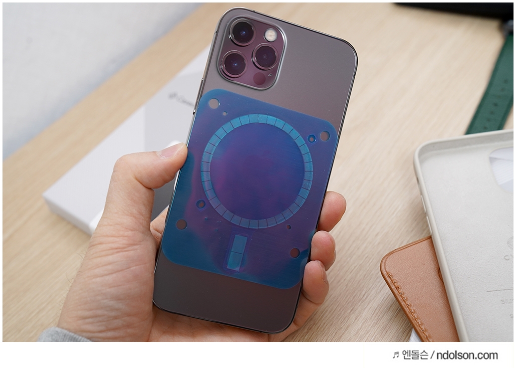 이렇게 아이폰12 프로 후면의 자석에 마그네틱 자석을 먼저 붙이고 케이스와 장착을 해야 정확한 위치를 찾을 수 있습니다.