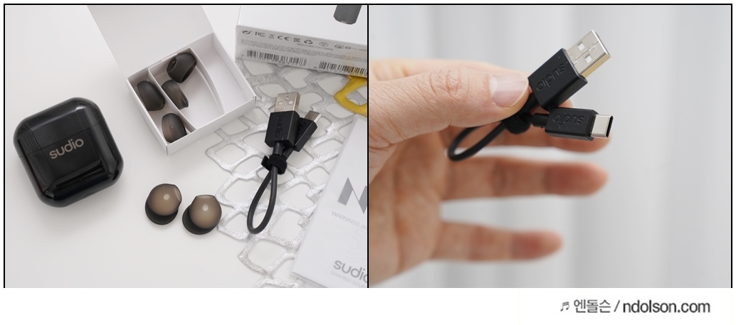 구성품은 수디오 정품 인증서 및 USB-C 타입의 충전 단자가 있습니다. USB-C 케이블이라 스마트폰 케이블로도 충전이 가능합니다. 혹시나 케이블을 잃어 버려도 걱정이 없는 호환성은 참 잘했네요. 또 이어팁이 무려 4쌍이 있습니다. 그건 참 잘했네요. 커널형과 콩나물 에어폰의 절묘한 조합입니다.