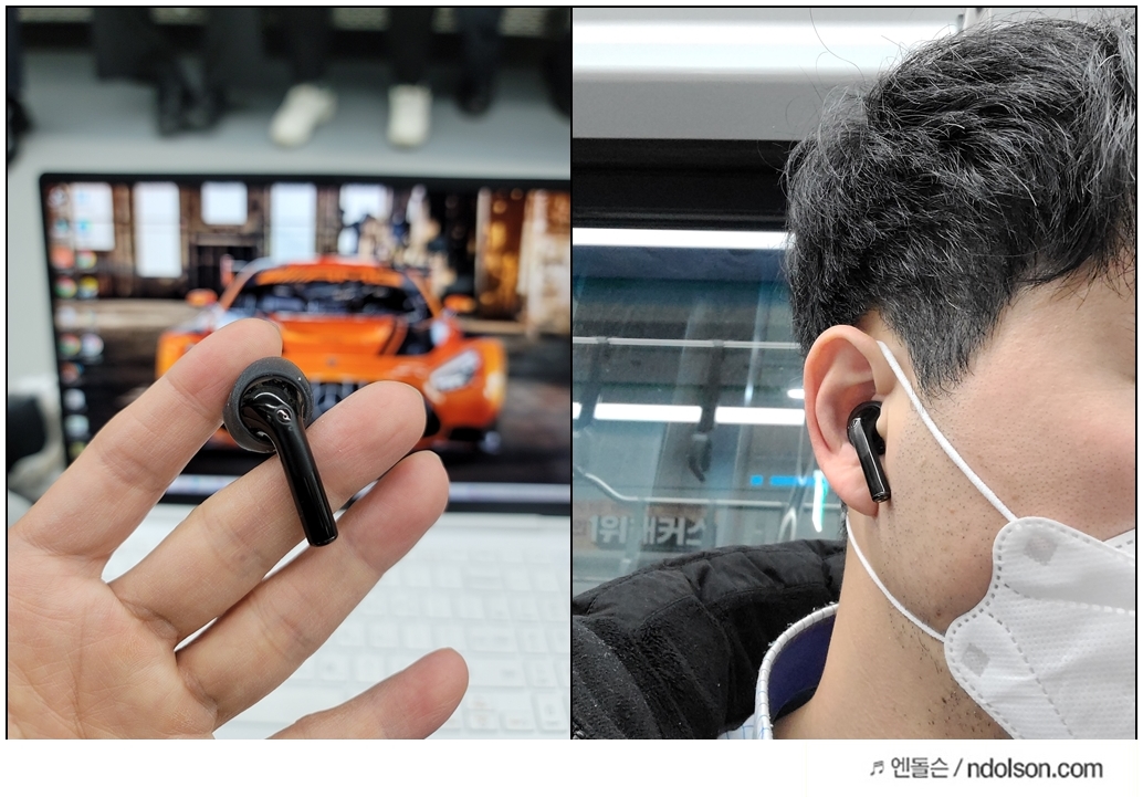 특히 버튼식이 아닌 터치센스가 있어 귀에 꽂은 이어폰을 한번 터치하면 재상 제어, 두번 누르면 다음곡 탐색이 가능한데요. 착용감도 에어팟 프로의 콩나물 모양이라 좋은 데, 커널형 이어팁이 추가되어 차폐가 더 잘 되는 점이 장점입니다.