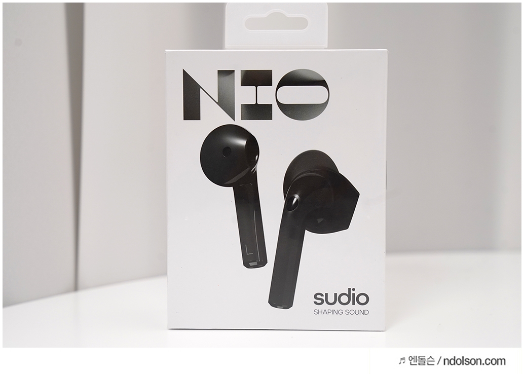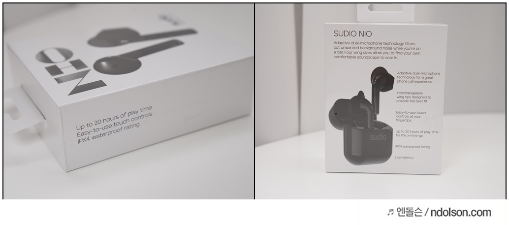 패키지는 개별 비닐포장으로 스크래치를 방지하였습니다. NIO 로고가 가장 먼저 눈에 뛰고 각 측면에는 수디오 니오의 제품 스펙이 보이는데요. IPX4 방수 등급과 20시간 이상의 긴 음악 재생시간이 눈에 들어 옵니다.