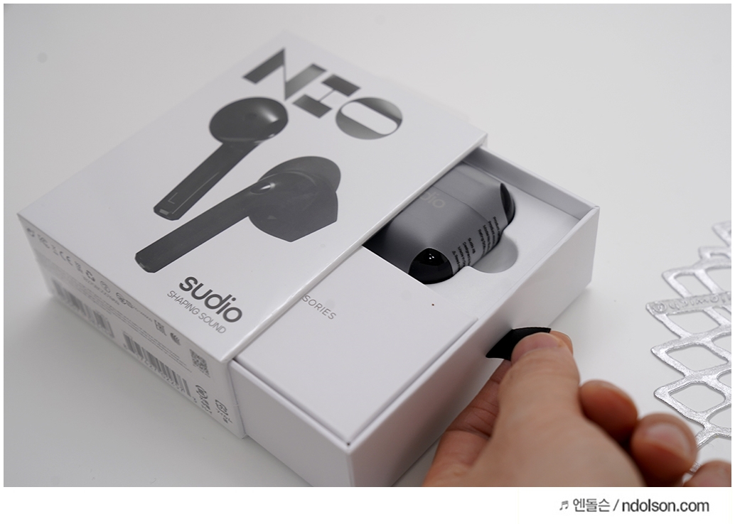 포장에 신경을 많이 썼네~ 옆으로 잡아 당기면 서럽이 열리듯 수디오 니오 이어폰이 보여집니다.