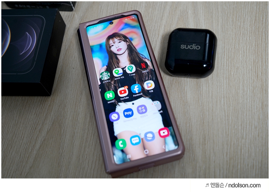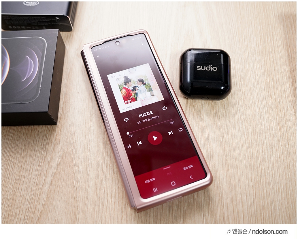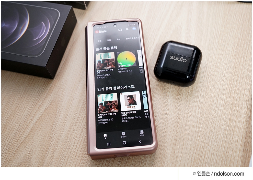갤럭시Z폴드2 로 음악을 들을 때 수디오 니오를 사용하여 보았습니다. 갤럭시폴드2가 무거워 가방에 넣어 둔 상태로 음악 듣기에는 무선이어폰이 상당히 편리합니다.