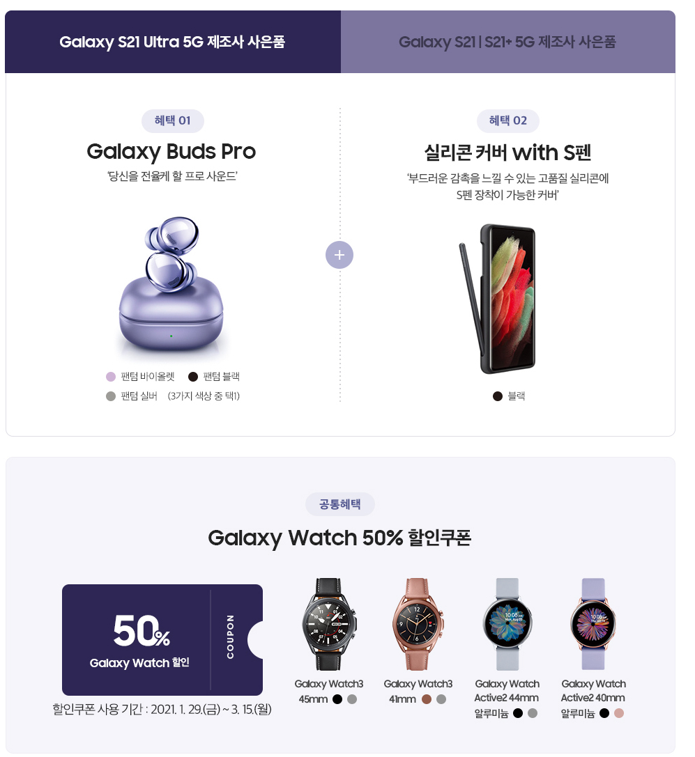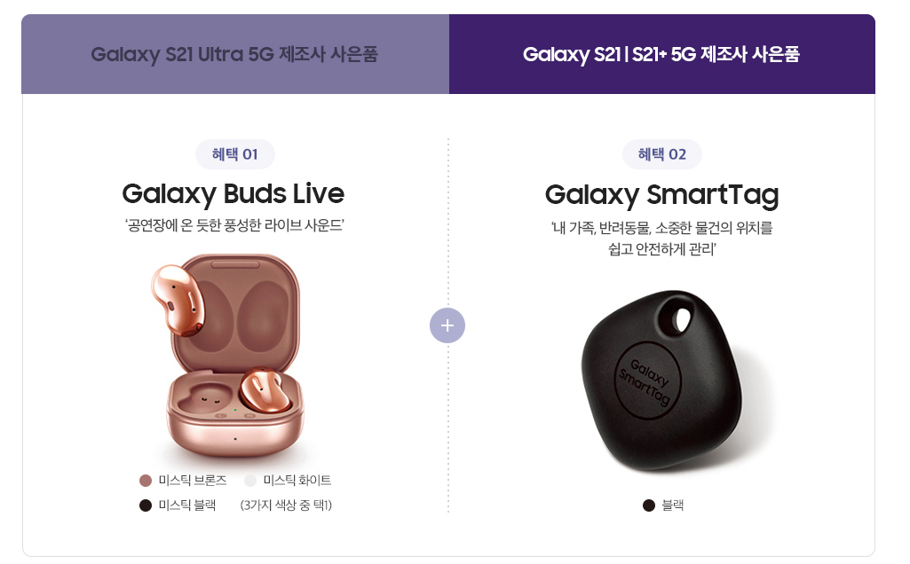 갤럭시S21 자급제폰을 구매하고 놓쳐서는 안될게 바로 갤럭시S21 구매자에 대한 삼성 제조사 혜택인데요. 갤럭시S21 / 플러스 구매자는 갤럭시 버즈 라이브와 갤럭시 스마트 태그를 줍니다. 또 울트라 구매자는 갤럭시 버즈 프로와 실리콘 커버 With S펜 케이스를 주는데요.