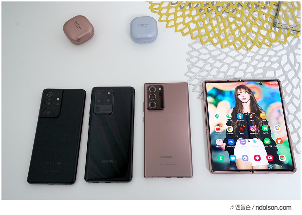 왼쪽부터 갤럭시S21 울트라, 갤럭시S20 울트라, 갤럭시노트20 울트라, 갤럭시Z폴드2 입니다.