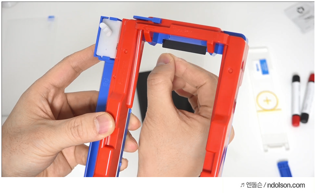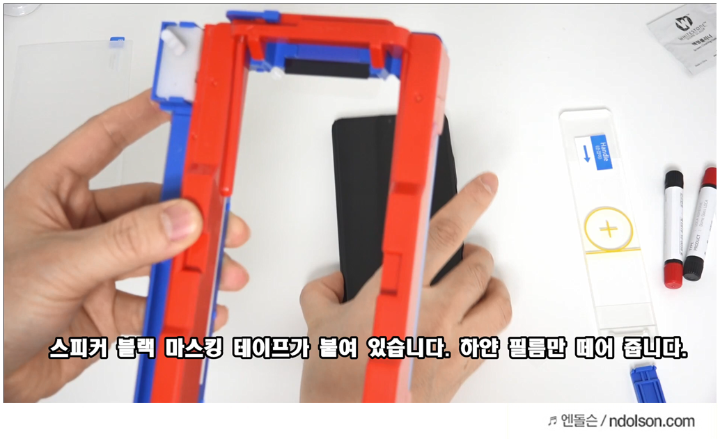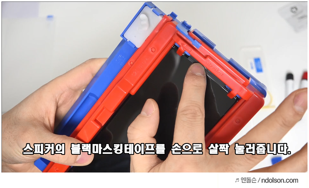 파랑, 빨강으로 된 지그의 위쪾을 보면, 스피커 블랙 마스킹 테이프가 있습니다. 하얀 부분만 떼어주면 됩니다.