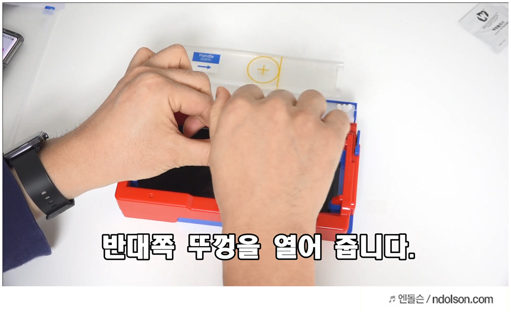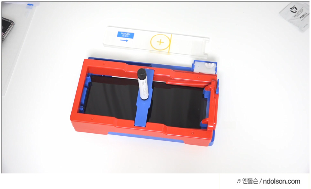 강화유리를 올려 줍니다. 바로 점착액에 붙지 않습니다.