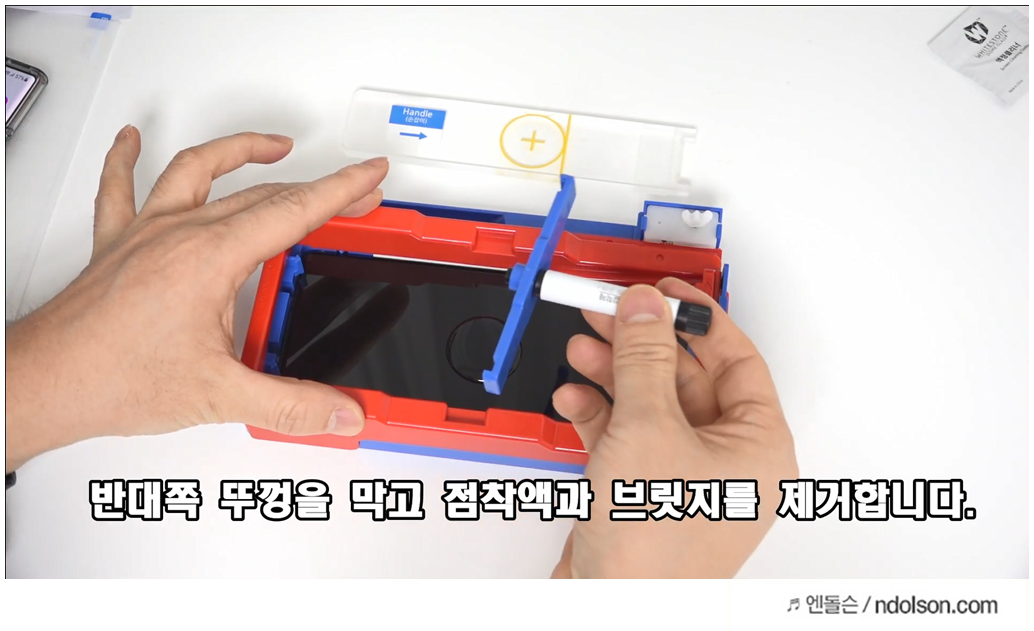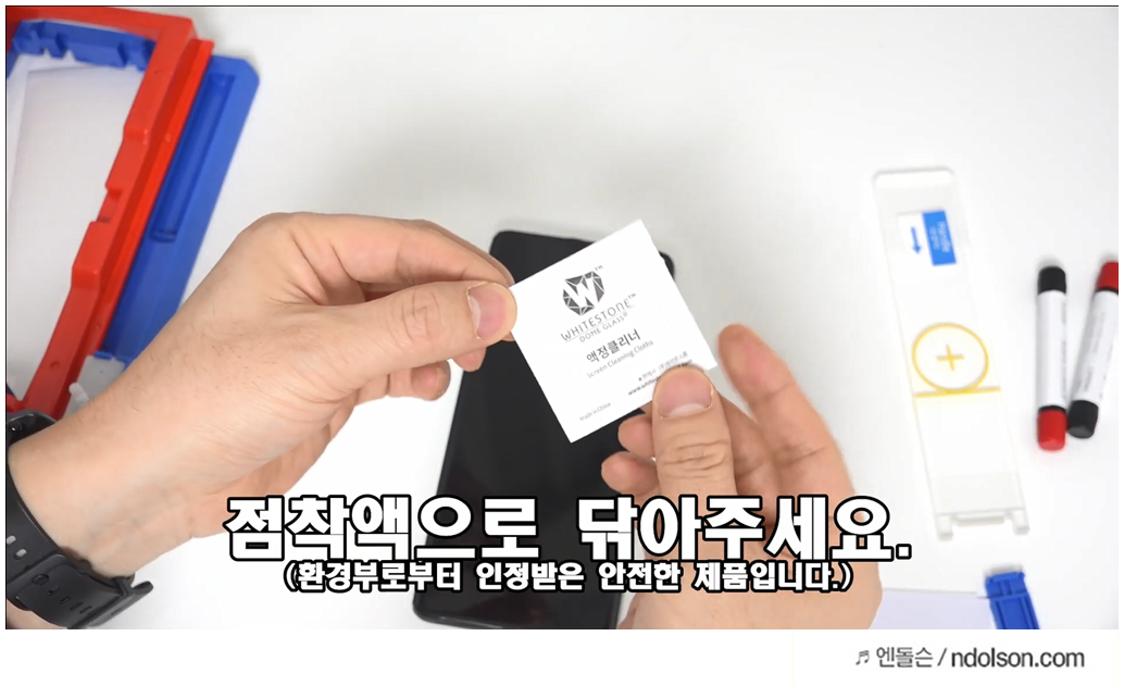 액정클리너로 전면에 이물질을 닦아 줍니다. 환경부로 부터 점착액과 액정클리너를 안전하다고 인정받았다고 하네요.