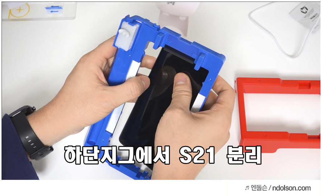 이제 지그를 들고 갤럭시S21 를 끼워 줍니다. 들고 하는게 더 편하네요.