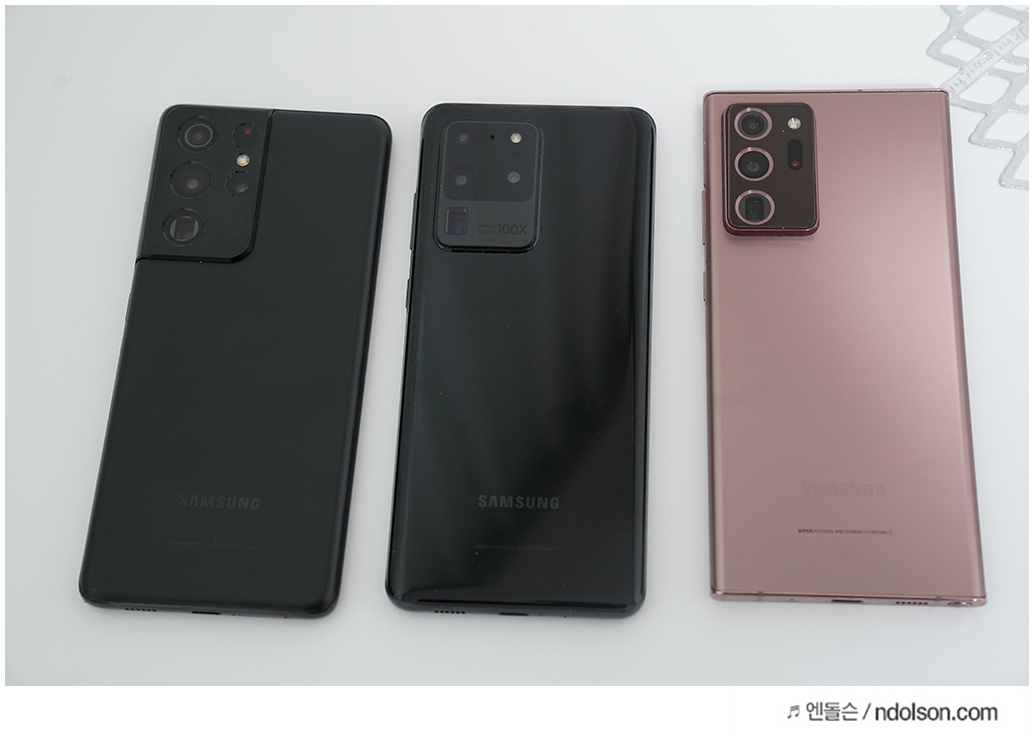 왼쪽부터 갤럭시S21 울트라, 갤럭시 S20 울트라, 갤럭시노트20 울트라 순입니다. 20배 줌 이상부터 줌 락(Zoom Lock) 기능이 지원되는 것은 오직 갤럭시S21 울트라 뿐입니다.