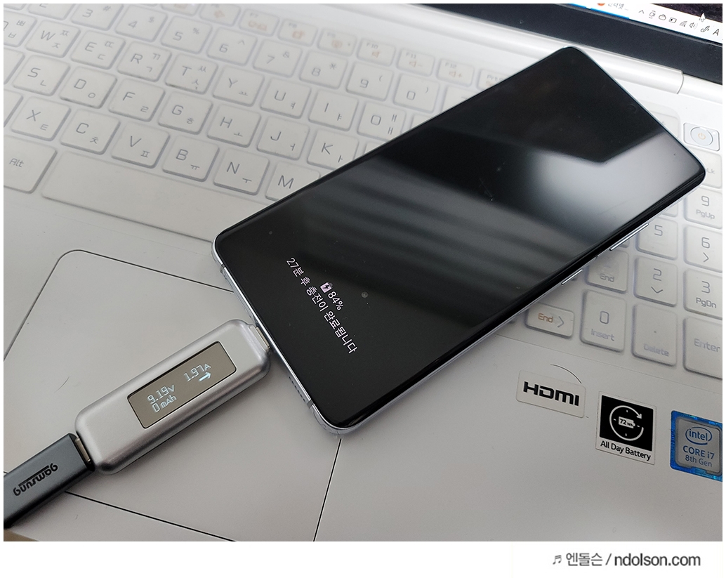 갤럭시S21 울트라의 고속충전을 테스트해보았습니다. 스펙상 25W 고속충전이 가능합니다.