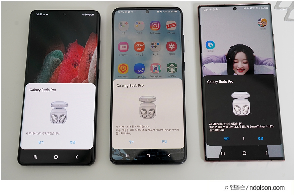 갤럭시 버즈 프로(Galaxy Buds Pro)는 갤럭시 옆에만 두어도 바로 페어링으로 찾기가 가능합니다. 굳이 착용하지 않도고 연동할 수 있습니다. 수동으로는 착용후 양쪽을 눌러주거나 삼성 웨어러블 앱에서 디바이스를 추가할 수도 있습니다.