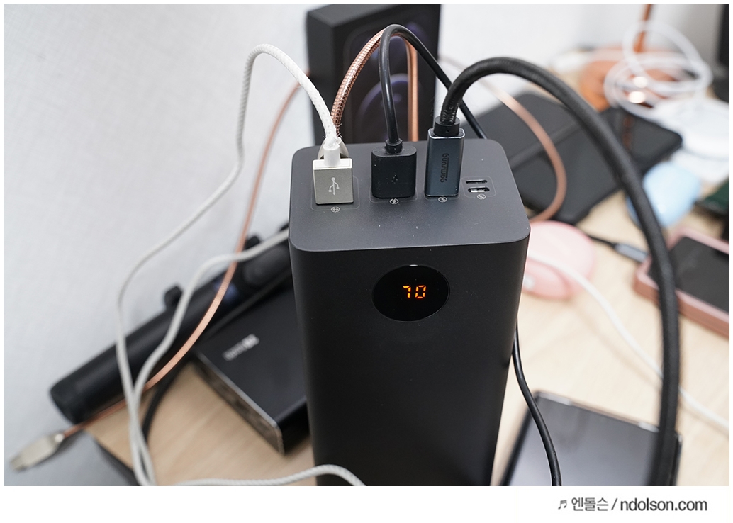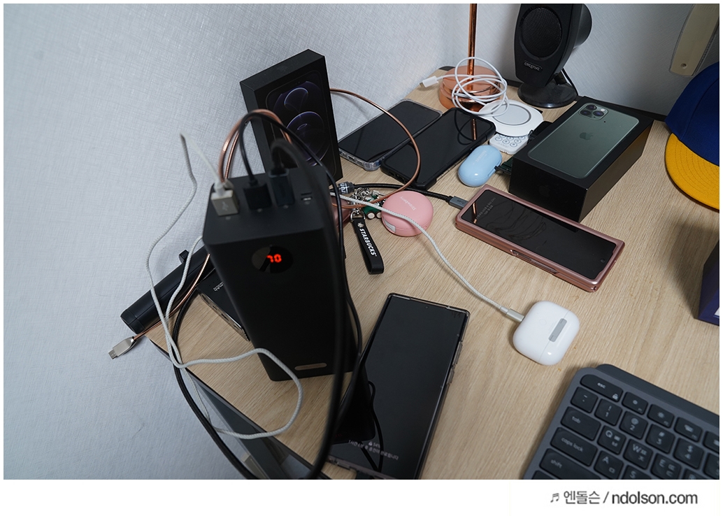 동시에 다수의 충전을 했습니다. 에어팟 프로, 갤럭시Z폴드2, 갤럭시노트20 울트라, 소니 A7M3 등 다양한 기기를 충전을 해도 배터리가 부담스럽지 않네요.