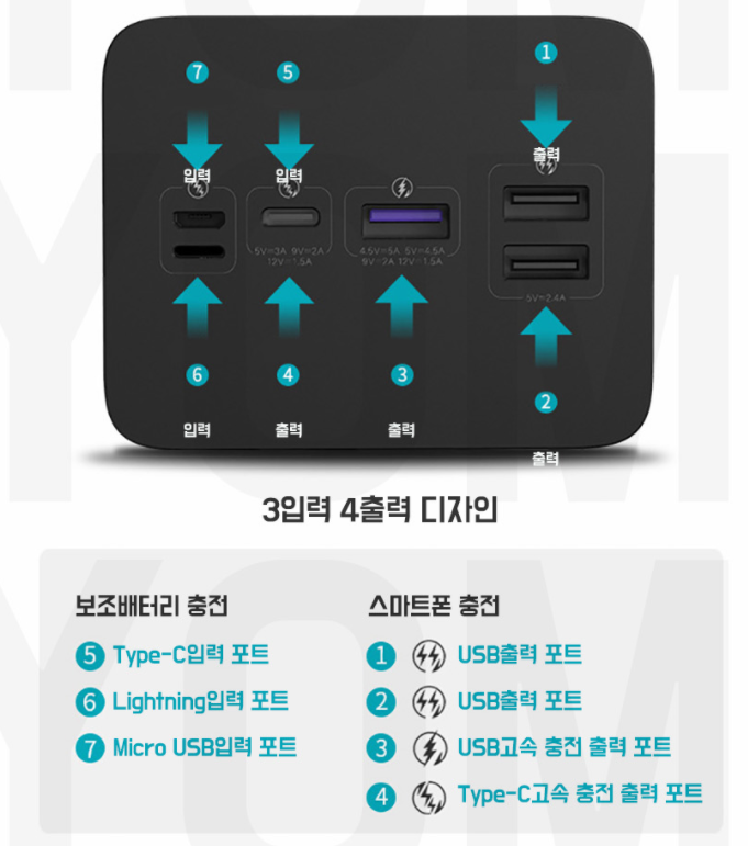 3개의 입력포트와 4개의 출력으로 구성되어 있습니다. Type-C 포토로 충전시 최고 18W 가 가능하며, 스마트폰 충전 시 최고 12V/1.5A (18W Max)가 가능합니다.