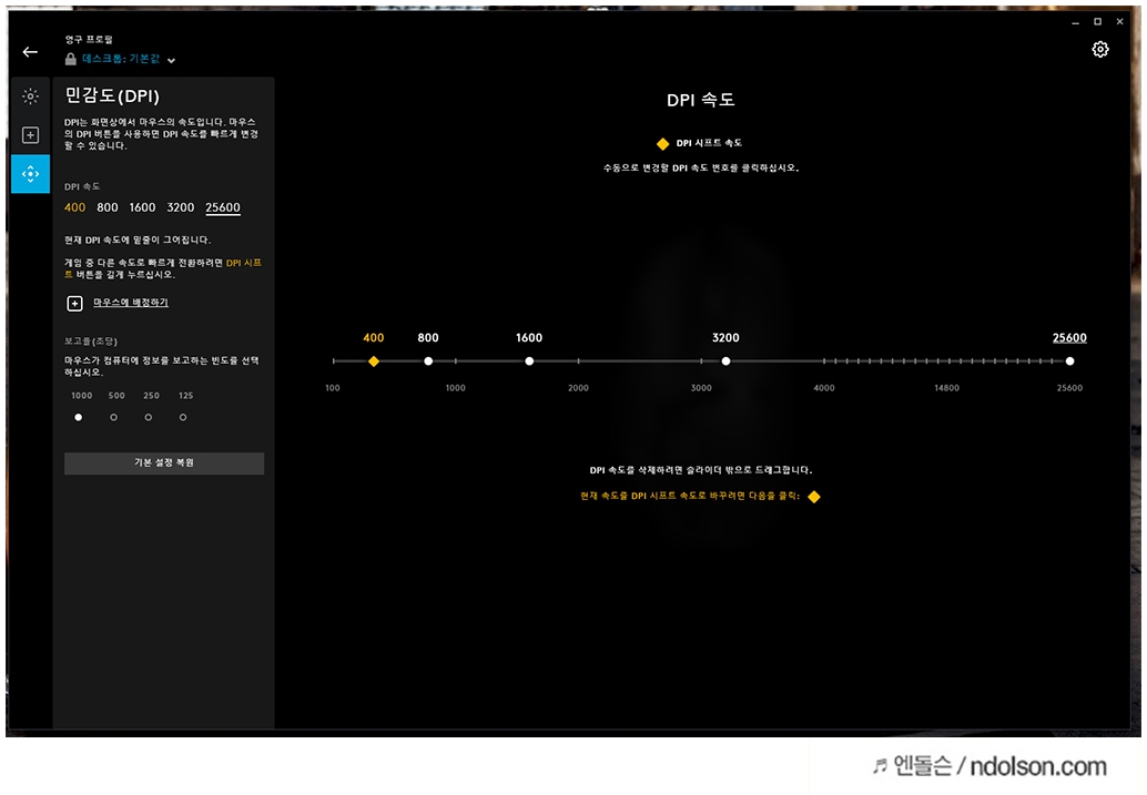 로지텍의 G HUB 의 설정을 통해서 상세한 설정이 가능합니다. 혹시 최고 25600을 설정이 안 된다면 펌웨어 업데이트를 해보세요. 마우스, 키보드 모두 관리해주는 프로그램입니다.