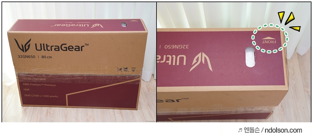 택배 왔다! 새로운 엠블럼이자 UltraGear의 약자인 UG 로고가 눈에 띄네요. 박스를 개봉할 때는 친절하게 전면 FRONT 표시가 있는 쪽이 앞이니 그쪽으로 열어야 편합니다.