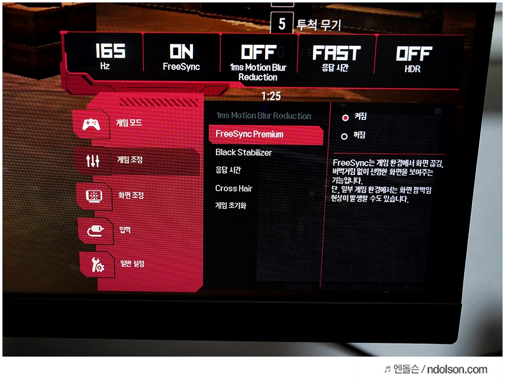 게이밍 모니터라면 빠질 수 없는 프리싱크 프리미엄(AMD RADEON FreeSync Premium) 기술 지원으로 게임을 할 때 부드러운 화면을 제공합니다. 게임을 할 때는 항상 켜짐으로 설정하여 게이머1로 지정해두면 편합니다.