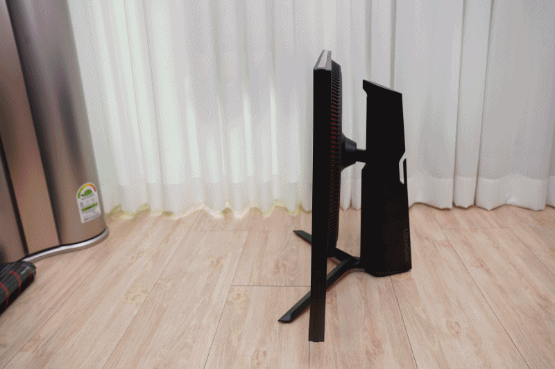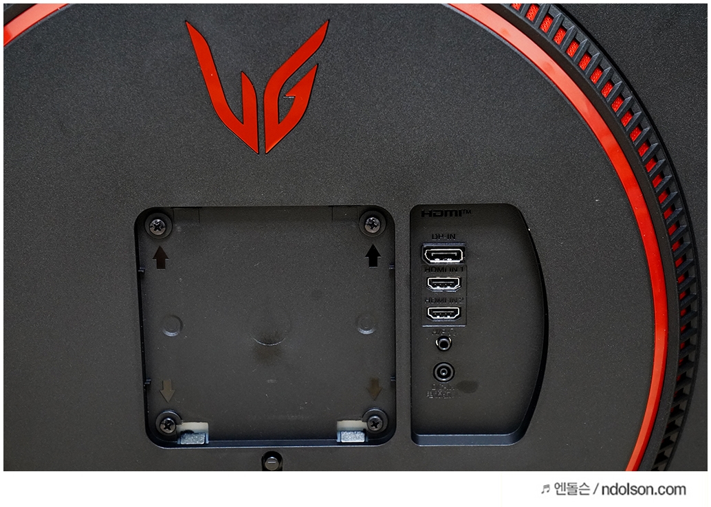 별도의 드라이버 필요 없이 원클릭스탠드로 후면에 끼우고 받침대는 손나사로 돌리면 쉽게 설치가 됩니다. 받침대 하단은 레드 컬러로, 강렬한 느낌을 줍니다.