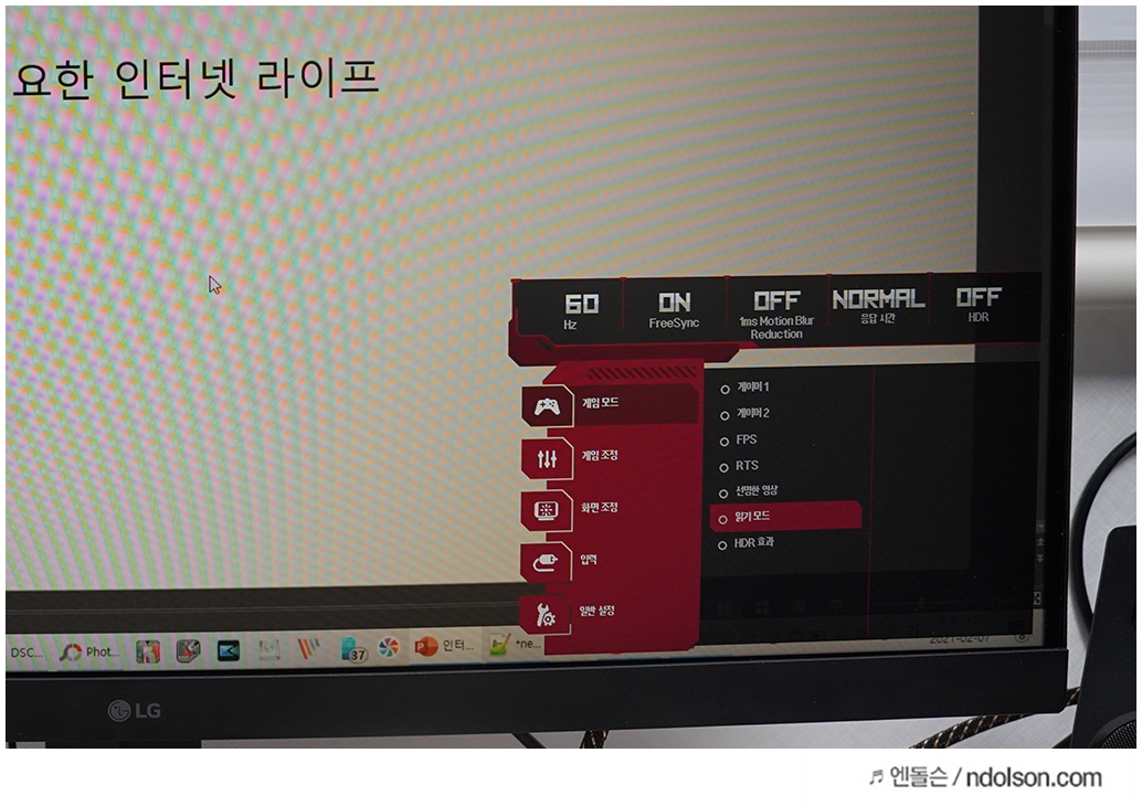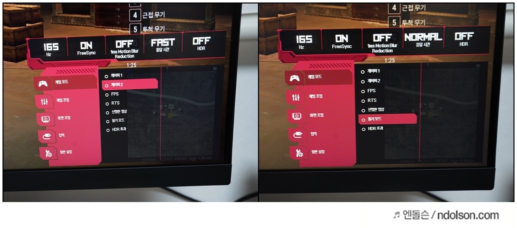 LG 모니터를 쓰면서 좋았던 점은 화면마다의 모드를 빠르게 바꿀 수 있다는 점입니다. 게이머1, 게이머2, FPS, RTS, 선명한 화면, 읽기 모드, HDR 효과를 통해 FAST 응답속도 세팅이나 HDR ON/OFF, 1ms MBR(Motion Blur Reduction) 등의 설정값을 빠르게 바꿀 수 있습니다.