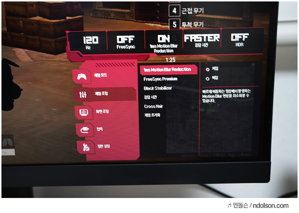 또 게임을 하면서 빠르게 움직일 때 잔상 등이 발생할 수 있는데, 1ms MBR(Motion Blur Reduction) 기능을 설정해두면, 모션 블러 최소화가 가능해 선명한 화면을 볼 수 있습니다.