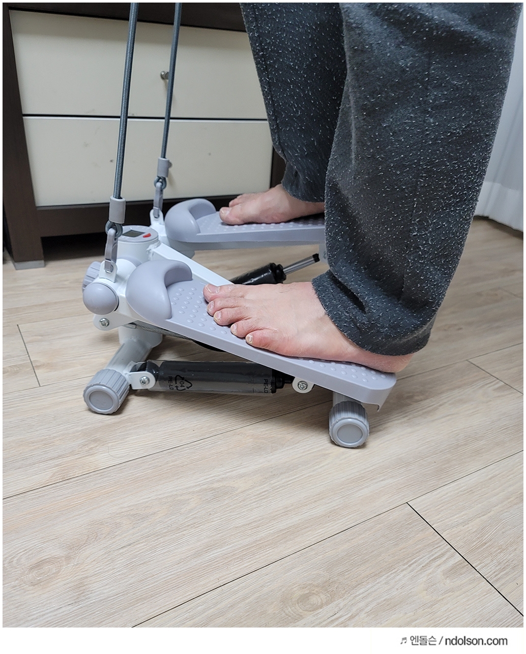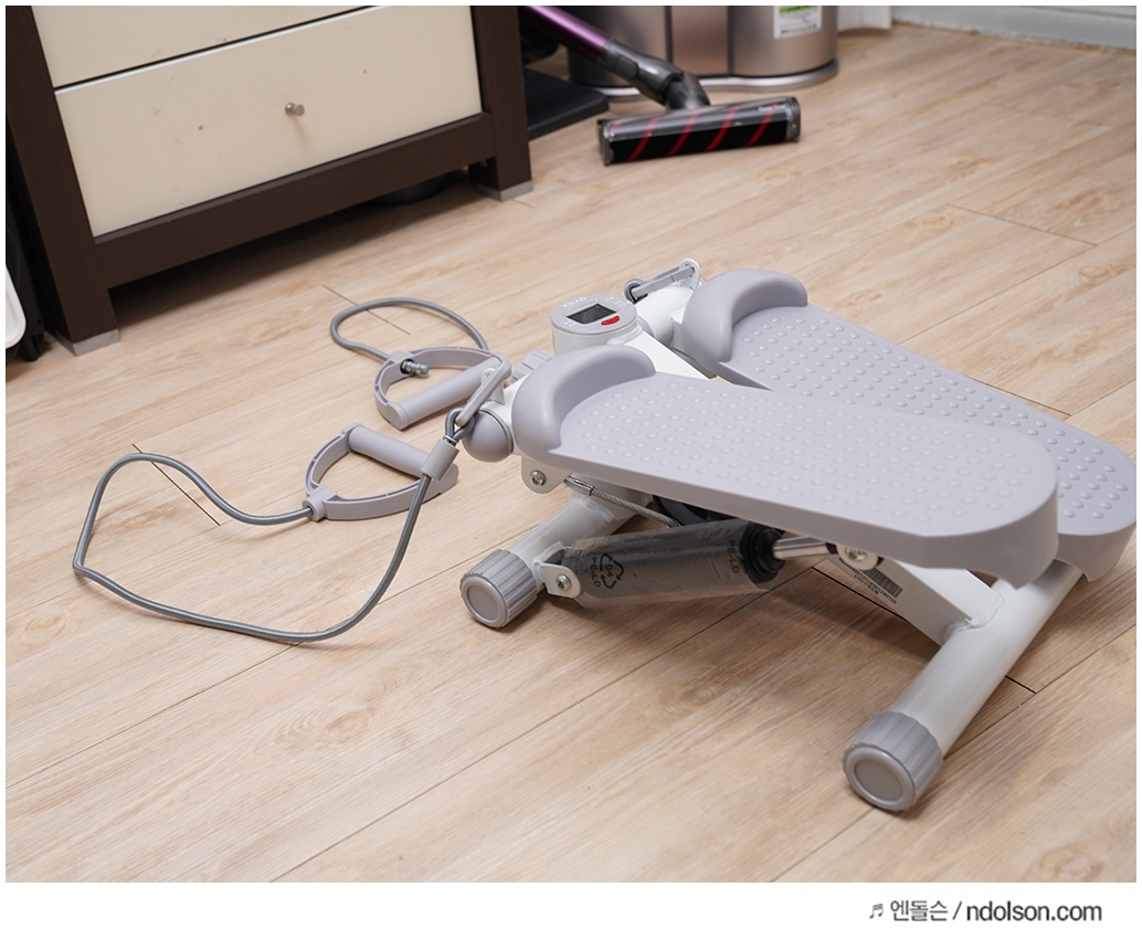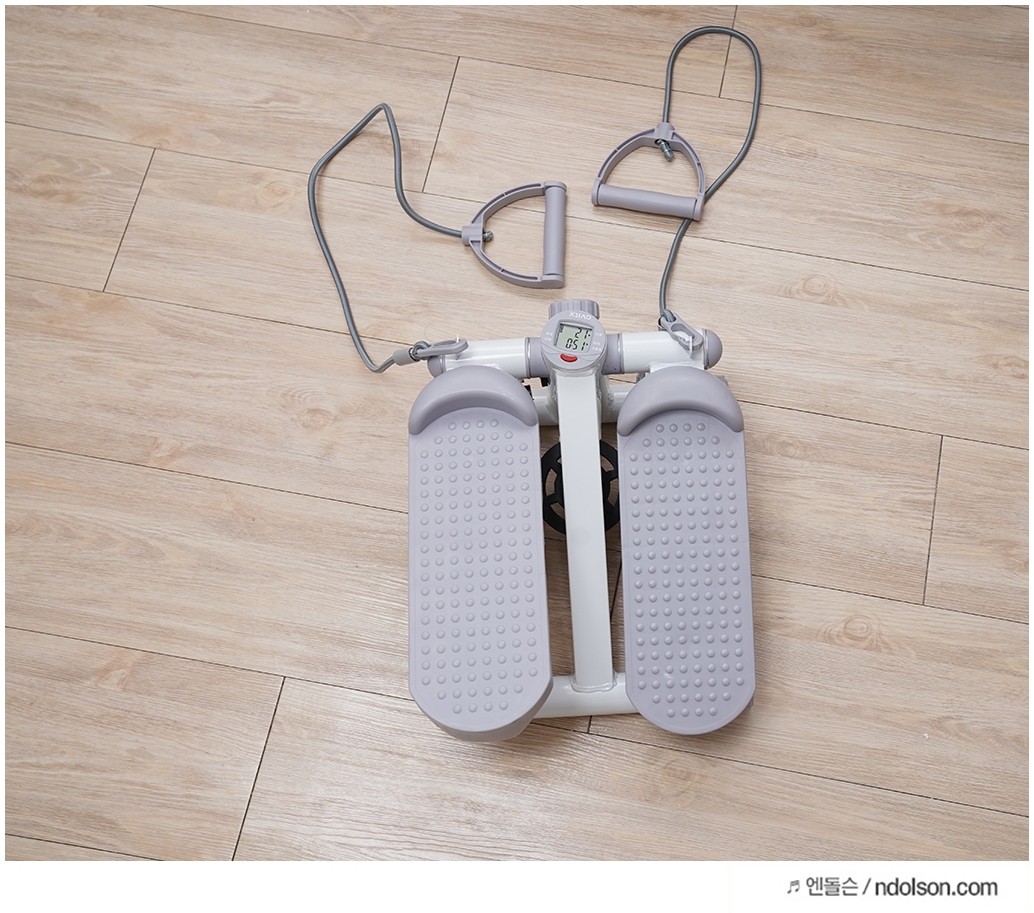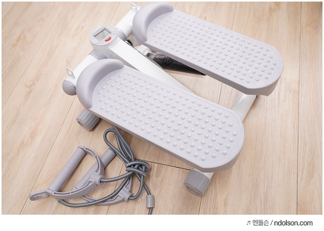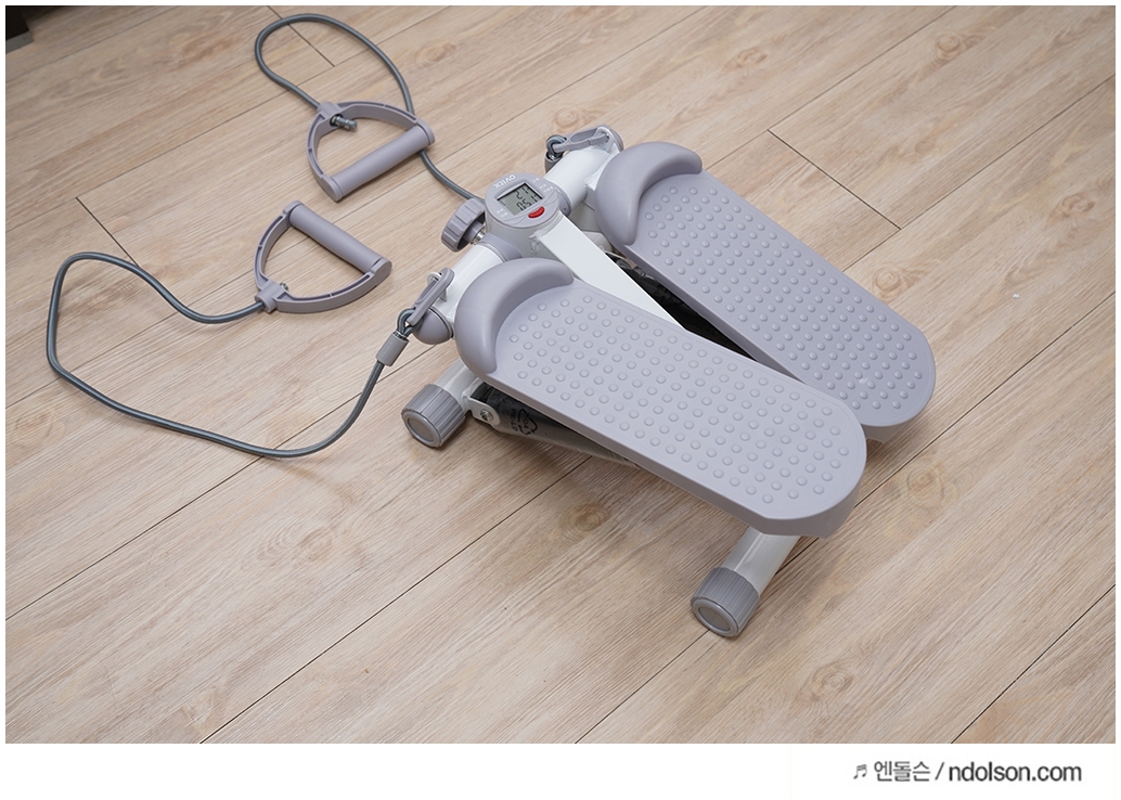 벽을 잡고 스텝퍼를 할 수 밖에 없다고 주변에서 이야기하던데 그렇지 않습니다. 또 팔과 허리 운동도 같이 할 수 있게 탄력끈을 당겨서 운동하기도 좋네요.