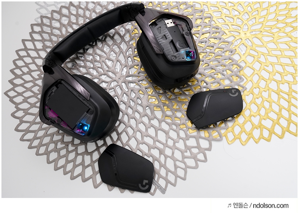 헤드셋 이어캡 외부 커버를 분리하면 무선 리시버를 보관할 수 있는 공간이 있습니다. 게이머 헤드셋의 보조 무선리시버는 잃어버리면 참 곤란한데요. 수납도 편리하게 지원되어 좋습니다.