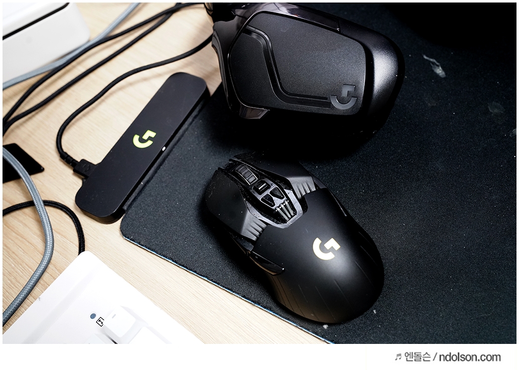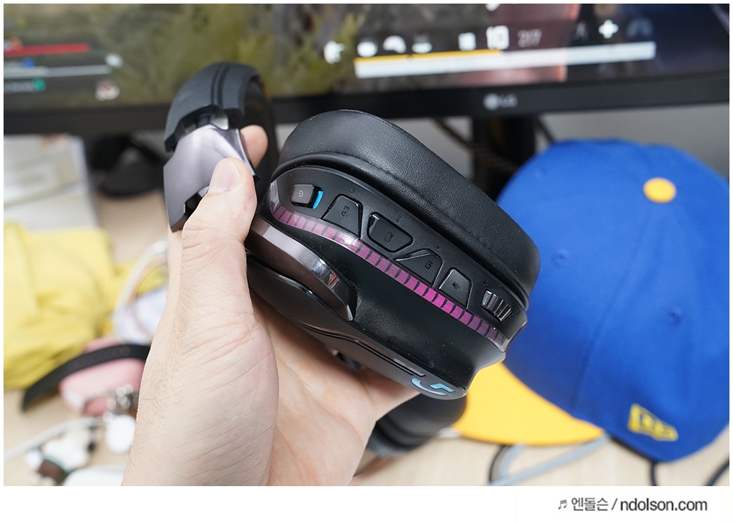 느낌을 전하자면 헤비급의 다부진 근육맨 같은데요. 마치 권투 경기에서 단번에 KO 시킬만한 프로 헤비급 선수 같다고 할 수 있습니다. 그래서 게이밍을 즐기고자 착용하면 이어패드가 귀를 착 감싸는 투구 같은데요. 안 보고도 누를 수 있는 G로지텍 기능키는 상황에 따라 눌러 동작시킬 수 있습니다.