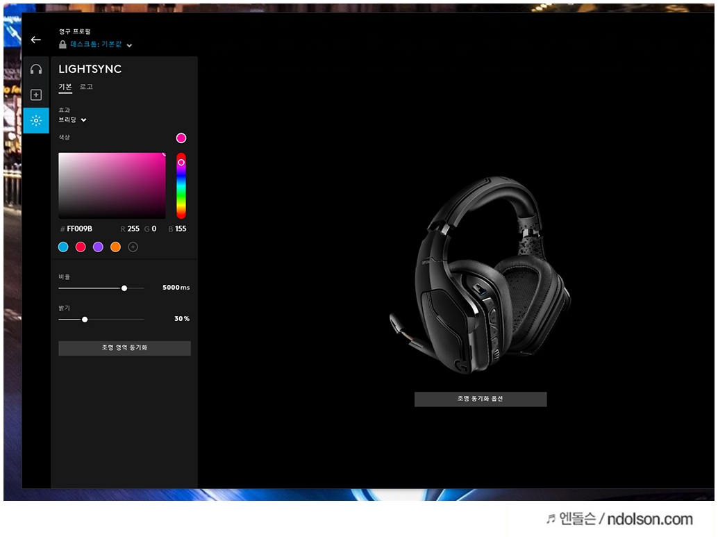 로지텍 G903 게이밍 마우스와 무제한 무선충전 파워플레이, 로지텍 G933S 게이밍 헤드셋의 RGB 색상을 동기화하였습니다.
