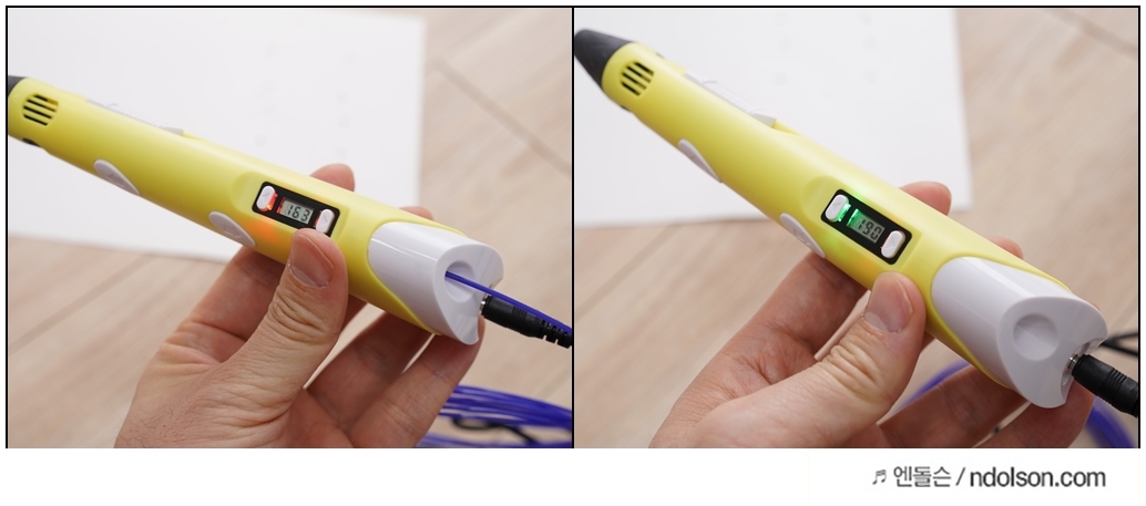 필라멘트를 3D 펜 뒤에 넣고 출력 버튼을 눌러주면, 나오기 시작하는 데, 우측면에 속도 조절을 해주면 됩니다.
