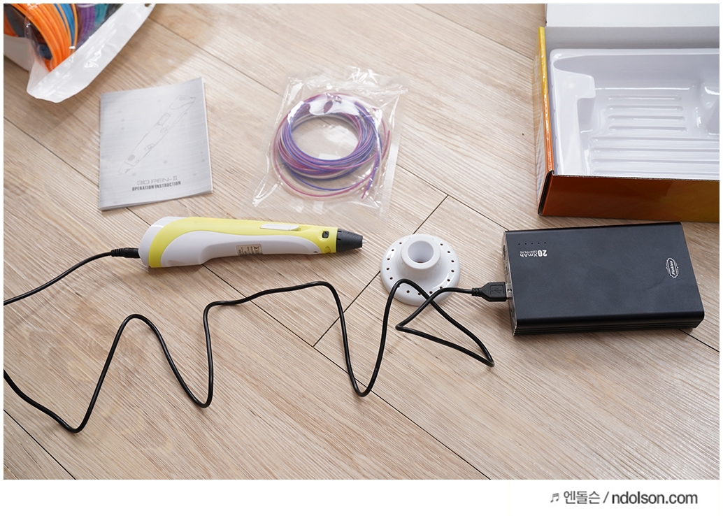 해당 제품은 외부 전력이 있어야 동작되는 3D펜입니다. USB 5핀 케이블로 연결하고 보조배터리를 연결하여 계속 사용할 수 있었습니다.