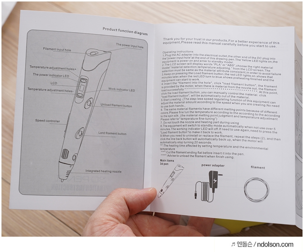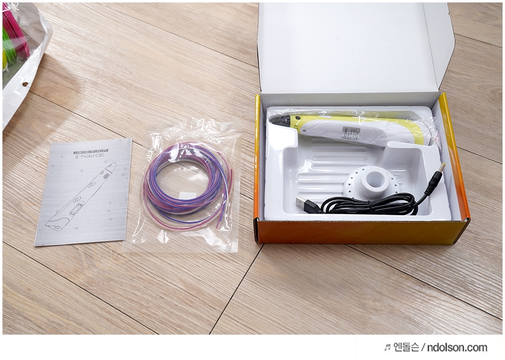 3D펜의 구성품은 영문 설명서, 3D펜, PLA 필라멘트, 거치대(케이스), USB 5핀 케이블로 구성되어 있습니다.