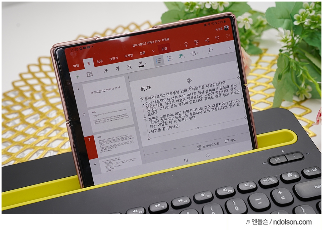 실제로 갤럭시Z폴드2로 파워포인트를 편집하고 있는 모습입니다. 영상 대본을 작성하거나 리포트를 작성할 때 어디서 쓸 수 있어 좋았습니다.