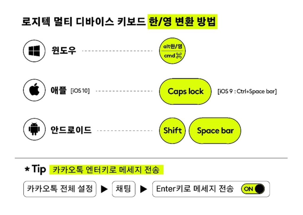 윈도우, 애플(iOS), 안드로이드 의 OS 환경에 따라 한/영 변경하는 방법이 다릅니다. 특히 맥에 익숙하다 보니 한/영 변환할 때 Caps Lock 키로 전환이 가능합니다. Karabiner 같은 유료 앱을 설치해서 설정해야 하지만, 로지텍 키보드는 공짜입니다.