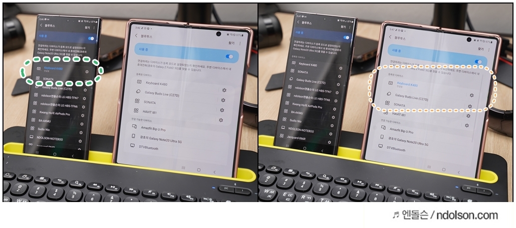다이얼을 돌리면 빠르게 갤럭시노트20울트라와 갤럭시Z폴드2의 블루투스 페어링이 되었습니다. 여러 장치를 동시에 제어할 수 있어 편하게 쓸 수 있고 거치대가 넓어 큰 태블릿도 거치가 가능합니다.