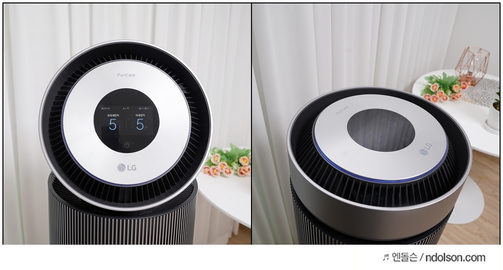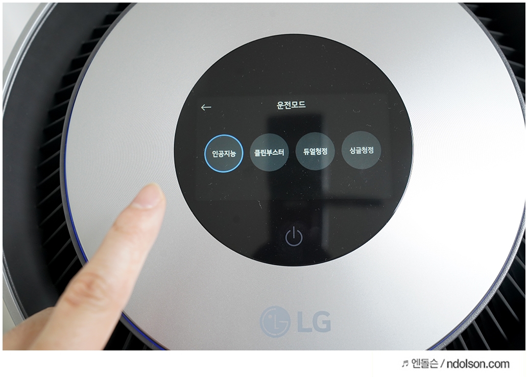 LG 퓨리케어 360도 공기청정기 알파는 스마트폰의 앱이나 디스플레이를 터치해서 조작할 수 있습니다. 전원을 켜면, 모드에 따라 공기청정기의 헤드 부분이 클린 부스터로 올라오게 됩니다.